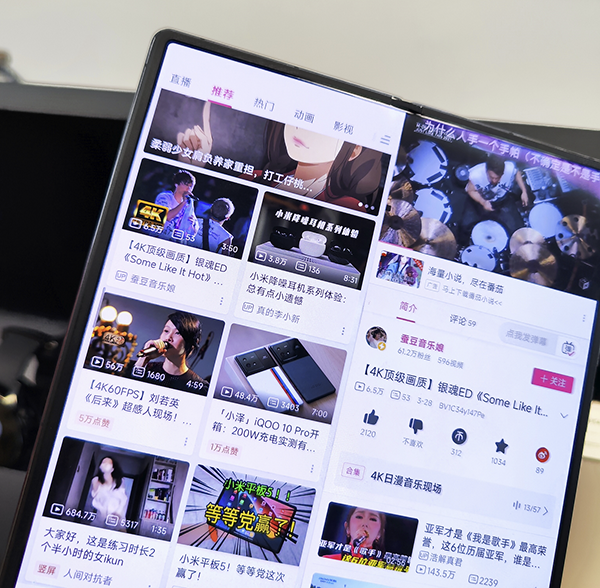 軟件適配方面,日常應(yīng)用解決適配得不錯(cuò),多屏應(yīng)用我們覺(jué)得小米算是目前折疊機(jī)中做得最好的。特別是打開(kāi)流媒體網(wǎng)站,比如B站,我們覺(jué)得體驗(yàn)非常新穎,之所以說(shuō)是新穎而不是好,是因?yàn)橛脩?hù)在獲得更多其他功能和網(wǎng)站界面的同時(shí),視頻窗口默認(rèn)實(shí)在太小,其實(shí)觀感已經(jīng)談不上好了。所以在多屏應(yīng)用下,窗口調(diào)整的策略其實(shí)是個(gè)比較麻煩的事情,有的時(shí)候或許會(huì)覺(jué)得很贊,有的時(shí)候就不見(jiàn)得那么實(shí)用了。