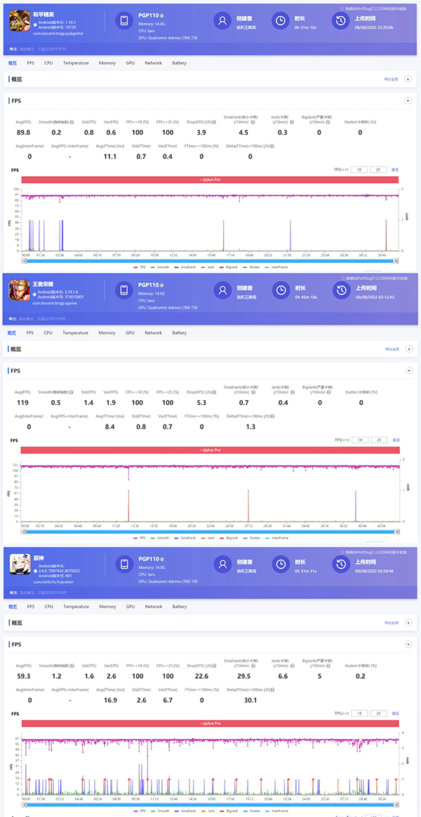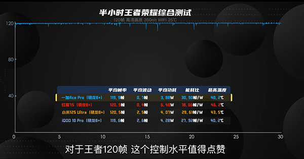 在一加Ace Pro發(fā)布之后,很多數(shù)碼博主也在第一時間發(fā)布游戲測試體驗(yàn)。像@搞機(jī)王騰霄表示經(jīng)過《和平精英》、《王者榮耀》和《原神》三輪實(shí)測之后,一加Ace Pro的表現(xiàn)和發(fā)布會上說的一樣很穩(wěn)。他在實(shí)測時都開啟了高畫質(zhì)和高幀率,但30分鐘的《和平精英》和40分鐘的《王者榮耀》,平均幀率分別為89.8幀和119幀,幀率表現(xiàn)相當(dāng)穩(wěn)定,只有在30分鐘《原神》時平均幀率達(dá)到了59.3幀,全程只有很小幅度的波動,這樣的表現(xiàn)讓@搞機(jī)王騰霄感到十分驚訝。