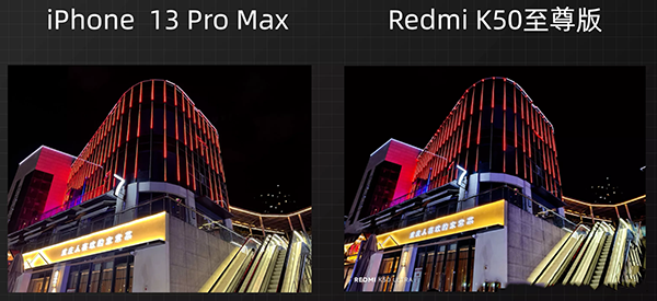 來(lái)到這組燈板對(duì)比環(huán)節(jié),高光壓制上K50至尊版表現(xiàn)得十分優(yōu)秀,和iPhone放在一起也不落下風(fēng),當(dāng)然更多的就是兩者在對(duì)于畫(huà)面處理風(fēng)格上的區(qū)別了。包括夜景的拍攝上,K50至尊版也有不錯(cuò)的暗部細(xì)節(jié)保留和高光壓制,整體的畫(huà)面出片還不錯(cuò),不過(guò)問(wèn)題還是有的,邊緣畫(huà)質(zhì)劣化,以及暗部能看到的銳化痕跡。