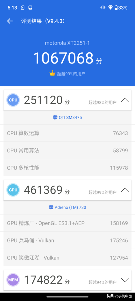 在安兔兔跑分中,摩托羅拉razr 2022的總分達(dá)到1067038分,其中CPU得分為251120分,GPU得分為461369分,從分?jǐn)?shù)上看符合我們的預(yù)期。