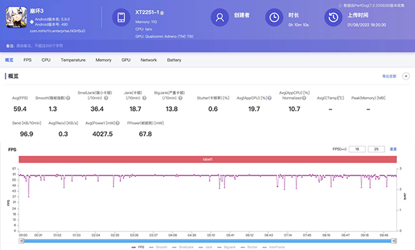 將手機(jī)亮度調(diào)至75%,外放音量50%,連接WiFi并在游戲側(cè)邊欄中選擇高性能模式,游戲設(shè)置為全高畫質(zhì)、全高特效,戰(zhàn)斗幀數(shù)90,頁(yè)面幀數(shù)60,當(dāng)前室溫25度的環(huán)境下,運(yùn)行10分鐘后崩壞書,可以看到實(shí)際戰(zhàn)斗的幀數(shù)上限還是60,不過(guò)幀率曲線很穩(wěn),偶爾有個(gè)別的小卡頓,但基本不影響游戲體驗(yàn)。最終平均幀數(shù)為54.9幀,功耗4W左右,機(jī)身表面最高溫度為39.5度,崩壞3的表現(xiàn)還是很穩(wěn)的,對(duì)付王者,和平精英也綽綽有余。