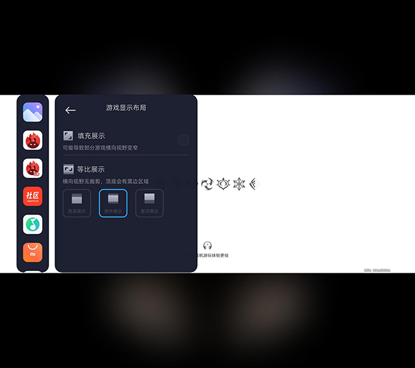 個(gè)人比較建議選擇填充展示或是將游戲等比展示在內(nèi)屏底部,此時(shí)可以在上方空余處打開攻略視頻、或游戲地圖等等,方便游戲。