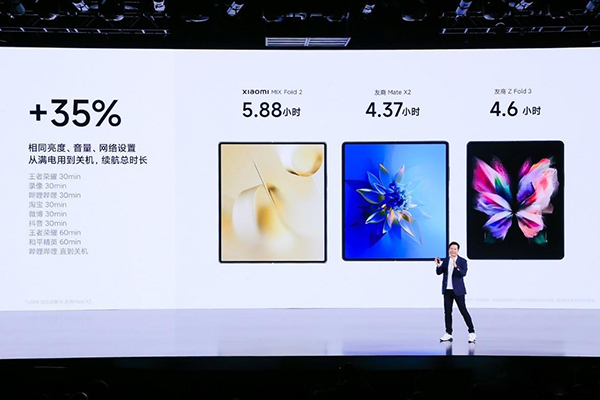 通過續(xù)航對(duì)比,在外屏體驗(yàn)上,MIX Fold2續(xù)航時(shí)長(zhǎng)達(dá)到6.67小時(shí),華為Mate X2的續(xù)航時(shí)長(zhǎng)為5.3小時(shí),三星Galaxy Z Fold3的續(xù)航時(shí)長(zhǎng)為4.88小時(shí),外屏使用時(shí)長(zhǎng),MIX Fold2增加了25%。