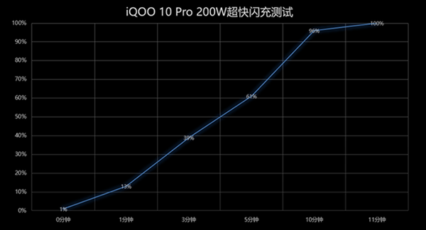 在快充上,iQOO一直走在行業(yè)前列。2年前,iQOO 5 Pro行業(yè)首發(fā)商用120W超快閃充;2年后的今天,iQOO 10 Pro首發(fā)商用200W超快閃充,并配備一塊4700mAh大容量電池。經(jīng)過(guò)實(shí)測(cè),在室溫26℃的環(huán)境下,電量自1%充至61%僅用時(shí)5分鐘,10分鐘可充至96%,11分鐘便滿血復(fù)活。