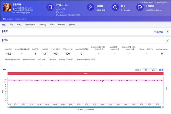 實測王者榮耀游戲連續(xù)兩局(30分鐘),使用PerfDog測得第二局全程幀率都能穩(wěn)定在120幀上下,平均幀率119.9幀可以說是非常非常穩(wěn)定的幀率表現(xiàn)了。