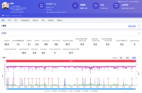 開啟高性能模式,使用PerfDog實測30分鐘原神,摩托羅拉X30 Pro平均幀率來到了59.2幀。這個幀率的確是非常的猛,要知道60幀原神+高畫質(zhì)其他很多手機甚至是游戲手機都跑不到這個幀率。從原神這樣吃性能的重載游戲的實測表現(xiàn)就能夠看出摩托羅拉X30 Pro的性能確實是很猛。