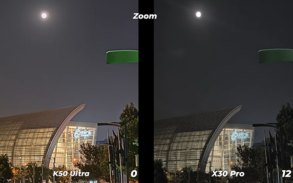 夜景變焦對比,Redmi K50至尊版還是更加優(yōu)秀,建筑物細節(jié)更豐富,亮度也高。Moto X30 Pro這邊亮度較低,細節(jié)出現(xiàn)了丟失。不過兩款手機的夜景變焦對比都出現(xiàn)了些許噪點和銳化的痕跡。