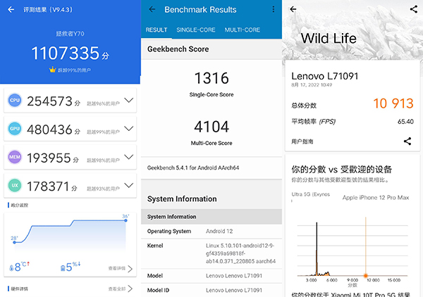 在跑分方面,室溫25攝氏度、無任何輔助散熱手段的情況下,拯救者Y70的安兔兔跑分輕松突破110萬;在GeekBench 5.4.1版本的跑分測試中,也輕松跑出了單核1316分、多核4104分的成績。在3D Mark的Wild Life項目中,拯救者Y70的成績?yōu)?0913分,這些分?jǐn)?shù)大體上都處于我們測試過的高通驍龍8+手機中上游位置,跑分成績和前代機型對比提升相當(dāng)明顯。