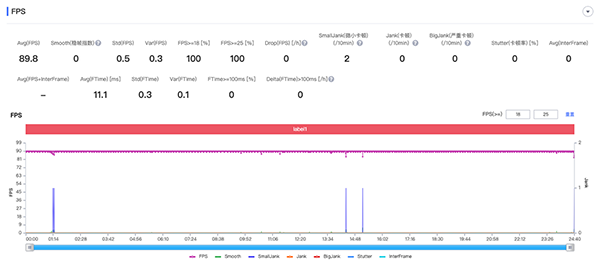 接下來第二款游戲《和平精英》,開啟90Hz高幀率模式進(jìn)行測(cè)試。結(jié)果依然很出色:拯救者Y70平均幀率89.8fps,同樣是接近滿幀的成績;Smooth(穩(wěn)幀指數(shù))依然是0,曲線同樣是近乎一條直線。