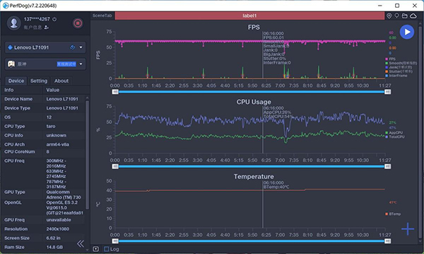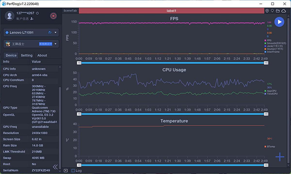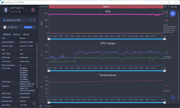 首先,挑了幾款支持144Hz刷新率的游戲,分別是《新魔神大陸》和《王牌戰(zhàn)士》,從測試數(shù)據(jù)可以看出,這兩款游戲都能保證穩(wěn)定144Hz刷新率,整個(gè)測試期間幾乎沒有出現(xiàn)掉幀,卡頓的現(xiàn)象,CPU和GPU的占用率也僅為3分之1,手機(jī)溫度要保持在39-41°C之間。從數(shù)據(jù)層面看,測試的結(jié)果是很理想的,但在這背后卻是硬件+優(yōu)化+散熱共同努力下的成果。