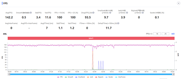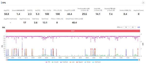 從這15分鐘的監(jiān)測(cè)數(shù)據(jù)來看,在打怪時(shí)幀率略有波動(dòng),其它情況下能夠保持在60幀左右,平均幀率能夠達(dá)到58.8幀,接近滿幀的水平了。