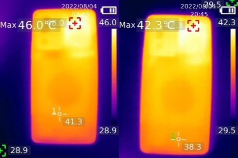 在“野獸模式”(圖左),溫度偏高,芯片區(qū)域達(dá)到了46℃,機(jī)身下半部分溫度在41.3℃左右。