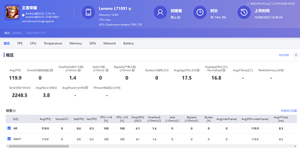 一局游戲打下來,《王者榮耀》高清畫質(zhì)平均幀率居然達(dá)到了119.9FPS,0卡頓率,無論是壓塔、開龍、還是全員團(tuán)戰(zhàn)拯救者Y70都可以做到無壓力全程滿幀運(yùn)行,這種流暢體驗(yàn),輕松carry全場!