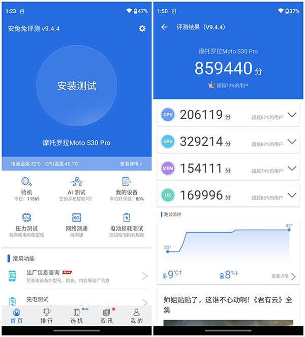 性能好壞的最直觀方式就是跑分了。用安兔兔軟件進(jìn)行跑分測試,結(jié)果為:859440分,這個(gè)跑分成績相當(dāng)不錯(cuò),當(dāng)前的熱門游戲基本都能滿幀運(yùn)行了。