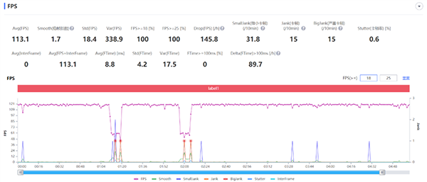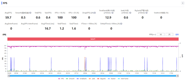 《和平精英》手游,我們優(yōu)先考慮最高幀率,在開(kāi)啟極限幀數(shù)+流暢畫質(zhì)下,經(jīng)過(guò)近20分鐘的測(cè)試,游戲平均幀率穩(wěn)定在59.7FPS,可以看到幀率趨于一條直線,整局游戲非常穩(wěn)定。