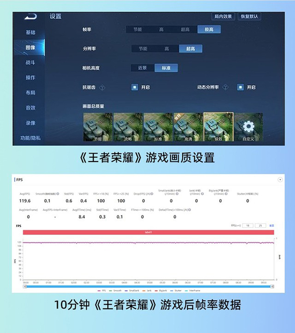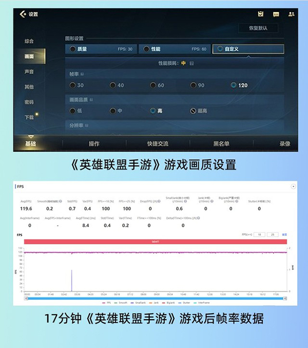 隨后,我們在《王者榮耀》極致畫質全開+120幀模式下,一加Ace Pro的10分鐘平均幀率為119.6幀,游戲全程幀率表現(xiàn)非常穩(wěn)定,沒有出現(xiàn)掉幀和卡頓的情況,即使是團戰(zhàn)時的幀率也十分穩(wěn)定。在同類的《英雄聯(lián)盟》手游開啟高畫質+120幀的模式下,一加Ace Pro一局游戲的平均幀率同樣為119.6幀,幀率表現(xiàn)近乎一條直線。