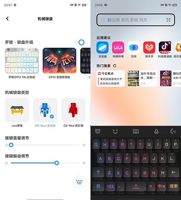 由于內置了一顆相當有力的X軸線性馬達,使用iQOO Z6玩游戲時可以打開“4D游戲振感”,熱門游戲中可以體會到音畫之外的觸感反饋。高端手機上出現(xiàn)過的“仿真機械鍵盤”功能也得到下放,可以把輸入法變成羅技/洛斐機械鍵盤的模樣,輸入體驗較以往有著非常大的進化。