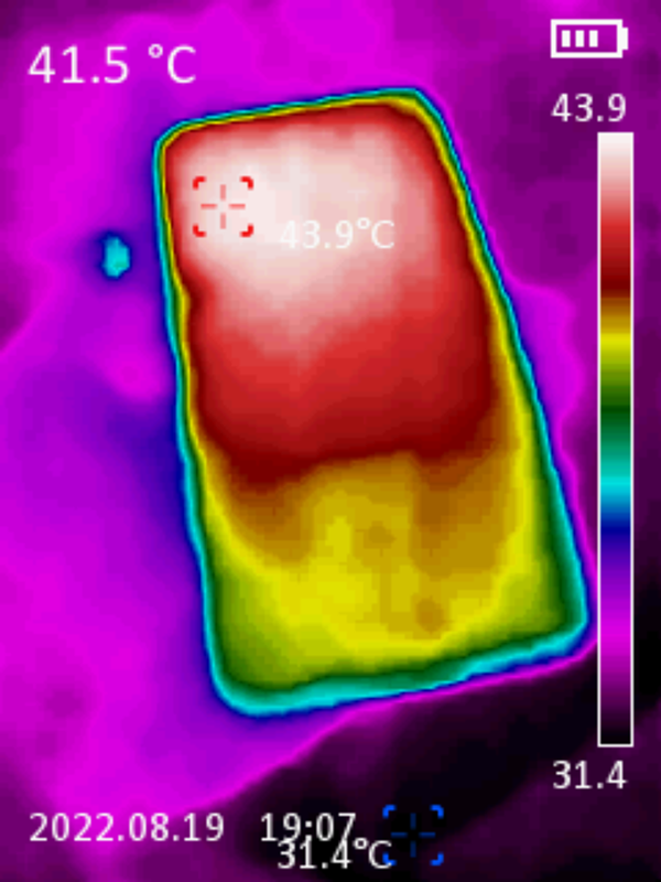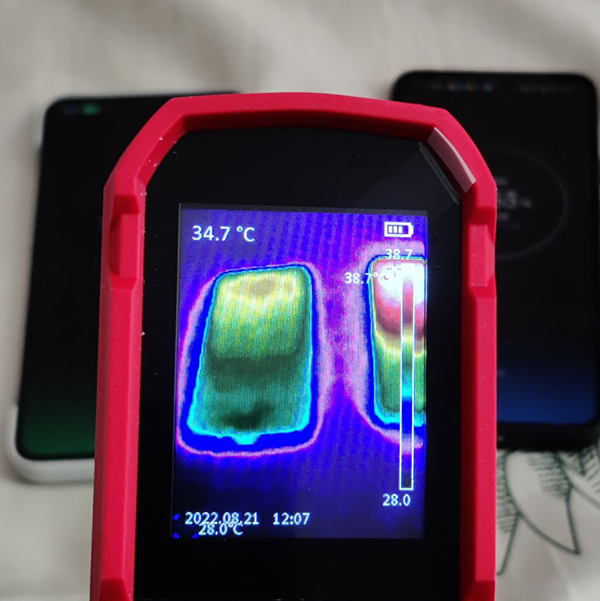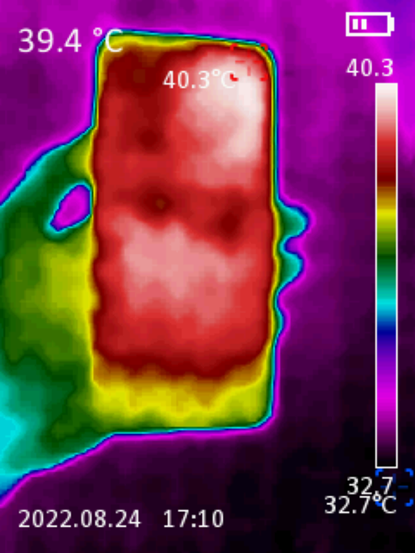 于是在我用一加“手機(jī)搬家”app將一加10Pro資料傳輸?shù)揭患覣ce Pro的過程中,我就拿出了熱成像儀同時對兩部手機(jī)做了溫度檢測,可以看到,左邊的一加Ace Pro明顯比右邊的一加10pro溫度要低,最大溫差接近4℃!