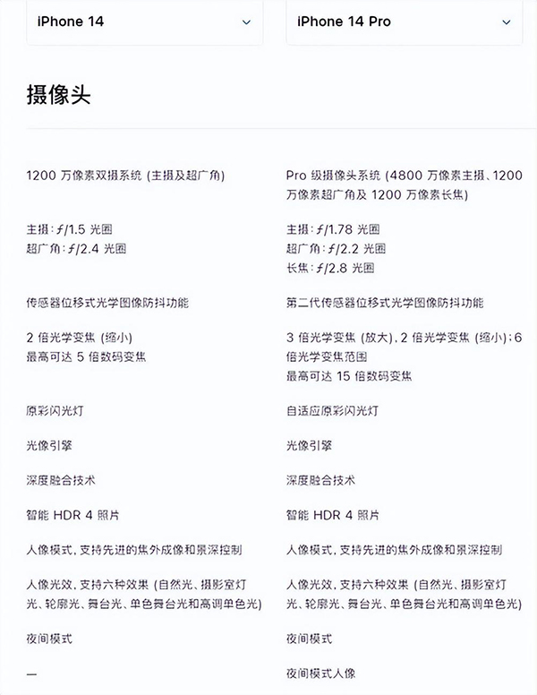 iPhone 14后置1200萬像素廣角主攝+1200萬像素超廣角雙攝組合,照片低光拍攝方面提升49%,視頻低光拍攝提升38%,支持位移式光學(xué)防抖。前攝為1200萬像素鏡頭。