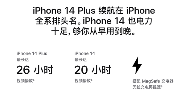 最大電池容量的iPhone 14 Plus擁有一定續(xù)航優(yōu)勢。據(jù)蘋果官網(wǎng)頁面顯示,iPhone 14 Plus的音樂播放時間可長達100小時,比iPhone 14 Pro的75小時、iPhone 14 Pro Max的95小時都要高出一截。iPhone 14 Plus的26小時比iPhone 14 Pro長了3小時。