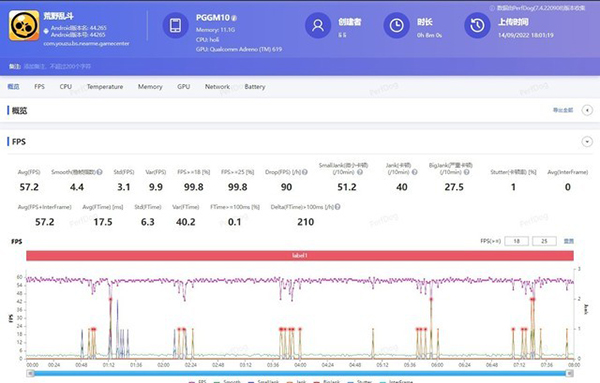 得益于驍龍695優(yōu)秀的性能以及HyperBoost全鏈路游戲穩(wěn)幀技術(shù)的加持,OPPO K10x在游戲過程中,整體幀率曲線都相當穩(wěn)定,平均幀率在57.2幀,幾處明顯的幀率波動是游戲加載環(huán)節(jié)帶來的。