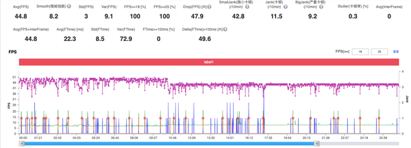 游戲全程25min下來平均幀率為44.8幀,開始時在50幀左右,在游戲進行到10min幀率開始平滑下降至45幀左右,然后穩(wěn)穩(wěn)地釘在45幀左右。曲線中的偶爾的幾次卡幀現(xiàn)象在我實際游戲中完全沒有感知,這個表現(xiàn)對于原神這種高強度榨干性能的游戲來說已經(jīng)算是十分流暢了,天璣8100真的打的隔壁中端U無地自容。