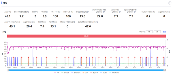 在《原神》中開啟最高畫質(zhì),在夜晚的璃月港跑圖測(cè)試30分鐘,平均幀率可達(dá)49.1fps,表現(xiàn)相當(dāng)流暢。