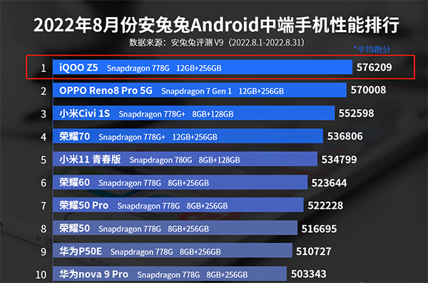 我們可以參考8月份安兔兔Android中端手機(jī)性能榜單,排第一的是Z5,跑分57萬+。由于iQOO Z6是8月底發(fā)布的,沒來得及參與到榜單排名。結(jié)合該機(jī)跑出的60萬+分?jǐn)?shù),我們能給它下個結(jié)論:Android中端手機(jī),性能領(lǐng)先,靠譜。