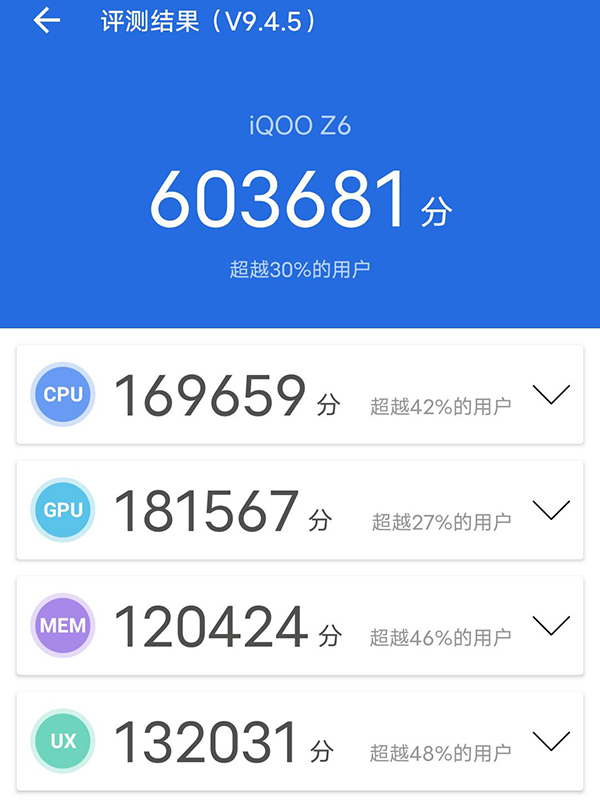 跑分方面,以安兔兔權(quán)威平臺為例,這里給出來的是整機(jī)性能分?jǐn)?shù),iQOO Z6獲得60萬+。這個分?jǐn)?shù)沒法跟旗艦手機(jī)百萬分相提并論,可在千元機(jī)里還是亮眼的。(順帶提下,它的高跑分既跟芯片性能有關(guān),還跟采用的LPDDR5+UFS 3.1滿血版內(nèi)存有關(guān))