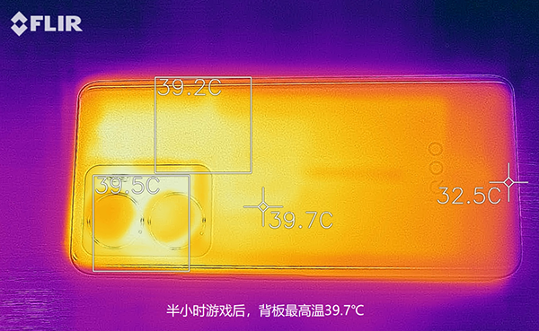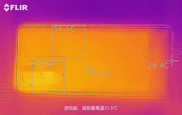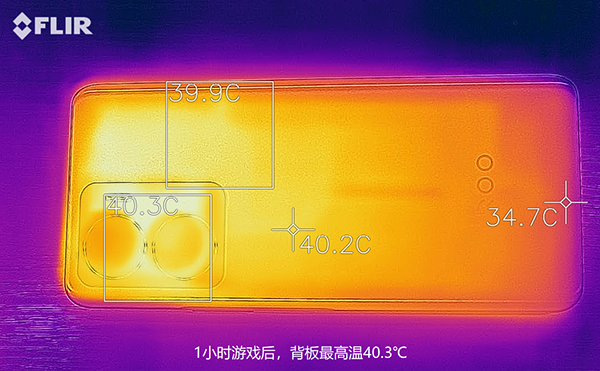 ②機(jī)身溫度。我使用紅外熱成像儀記錄了游戲前、半小時游戲、1小時游戲后的背板最高溫,分別是31.5℃、39.7℃和40.3℃。