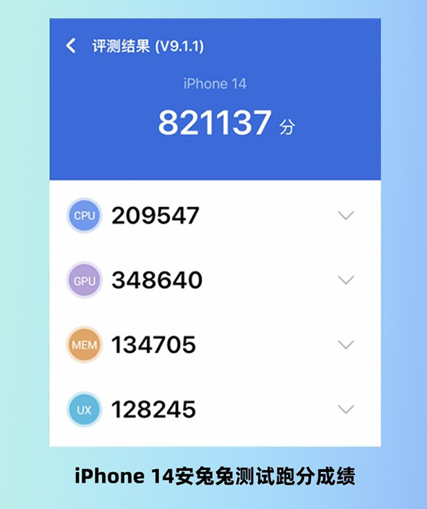 在基準(zhǔn)性能測(cè)試中,我們發(fā)現(xiàn)和預(yù)期中的一樣在新版散熱配置的加持下iPhone 14能夠?qū)崿F(xiàn)A15滿血版處理器性能的充分釋放。在安兔兔V9測(cè)試中iPhone 14取得了821137萬分的優(yōu)異成績(jī),這一成績(jī)相比搭載了iPhone 13同款的“殘血版”A15處理器但散熱表現(xiàn)優(yōu)秀的iPhone SE 3提升了12%左右。并且通過對(duì)比子項(xiàng)成績(jī)可以發(fā)現(xiàn),iPhone 14在CPU、GPU、存儲(chǔ)方面的性能均有提升,這一些成績(jī)提升一方面得益于A15滿血版處理器在核心性能方面的升級(jí),另外一方面也受益于本次iPhone 14的RAM提升到了6GB LPDDR4X的規(guī)格。