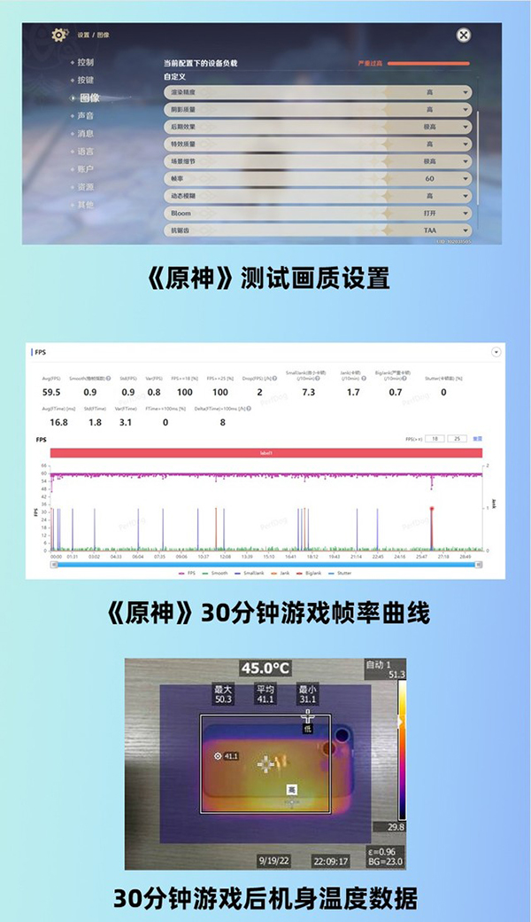 最后,我們也進(jìn)行了知名手機(jī)性能測(cè)試游戲《原神》的重負(fù)載,測(cè)試中我們將畫質(zhì)選項(xiàng)設(shè)置為極高畫質(zhì)+60幀,測(cè)試場(chǎng)景為璃月港跑圖,iPhone 14 30分鐘游戲的實(shí)測(cè)平均幀率為59.5幀,幀率曲線波動(dòng)極小,全程沒有出現(xiàn)大幅度降幀現(xiàn)象,游戲畫質(zhì)觀感相當(dāng)出色。在經(jīng)過30分鐘《原神》重負(fù)載測(cè)試之后,我們測(cè)量了iPhone 14的機(jī)身后蓋溫度,實(shí)測(cè)溫度為平均45攝氏度,在同類機(jī)型當(dāng)中屬于正常表現(xiàn),這也體現(xiàn)了iPhone 14新增的散熱配置發(fā)揮了一定作用。