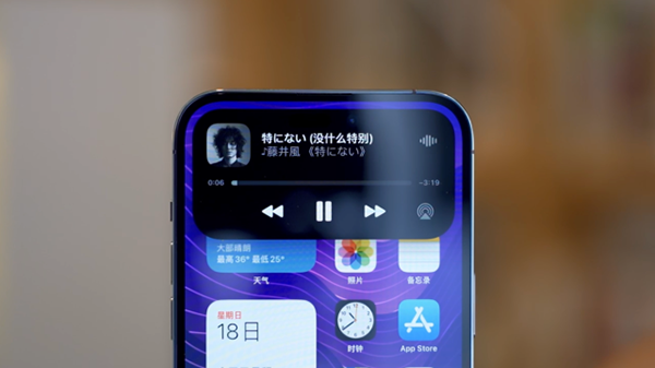 這時候的靈動島其實并沒有承載任何信息。但當你給手機充電、連接AirPods、導航甚至是播放音樂,這個靈動島的形狀就會發(fā)生改變。當你返回主界面的這時候,這些動態(tài)的信息就會成功登島。以靈動島方式提醒你這些信息還在持續(xù)著,用戶也可以通過長按靈動島讓它改變形狀,看到更具體的信息。像發(fā)布會所展示的計時、錄音、播放音樂以及打電話就是這樣的。
