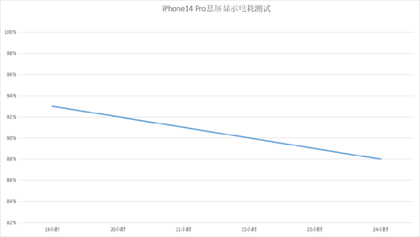 在最后的六個小時中,iPhone 14 Pro的表現(xiàn)還算穩(wěn)定,保持著每小時剩余電量下降1%的規(guī)律,經(jīng)過六小時的測試,最后手機(jī)剩余的電量為88%,耗電量表現(xiàn)出色。當(dāng)然,本次測試模擬的是真實(shí)用機(jī)環(huán)境,也就是說在打架真實(shí)的用機(jī)環(huán)境中,即便是一天不用手機(jī),手機(jī)的電量也會自己偷偷地下降。