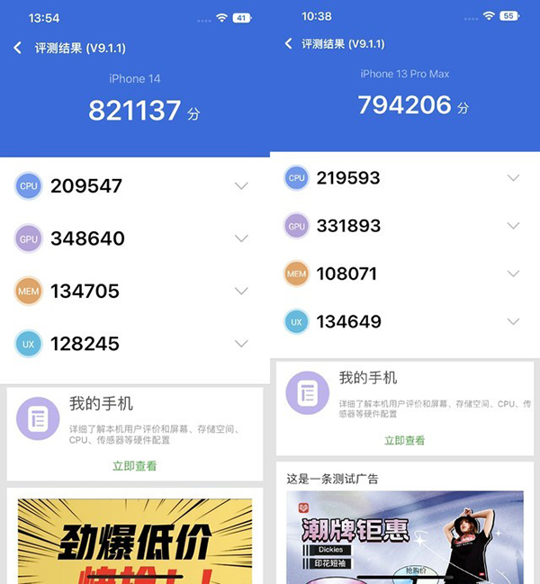 通過安兔兔測試可以看出,其中iPhone 14的得分為821137分,iPhone 13 Pro Max的得分為794206分。通過跑分可以明顯的看出iPhone 14的綜合能力要優(yōu)于iPhone 13 Pro Max,即便采用了相同處理器,但性能依然有區(qū)別。
