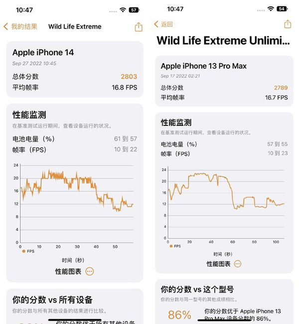 通過3DMark Wild Life Unlimited,我們可以看出iPhone 14的成績相較于iPhone 13 Pro Max要更加優(yōu)秀一些,其中iPhone 14的得分為2803分,分均幀率為16.8幀;iPhone 13 Pro Max的得分為2789分,分均幀率為16.7幀,不論是跑分還是流暢度表現(xiàn)iPhone 14的數(shù)據(jù)都更好。但是,不同的手機在測試時是有一定誤差的,在3DMarkWild Life Unlimited測試中,我們也可以認為兩臺手機的表現(xiàn)幾乎一致。