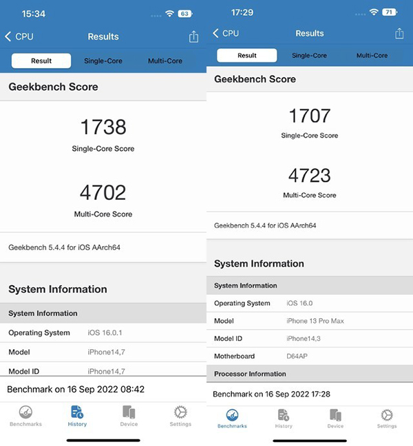 而在GeekBench測試中,iPhone 14的單核跑分為1738分,多核跑分為4702分;而iPhone 13 Pro Max的單核跑分為1707分,多核跑分為4723分。兩款手機不論是單核還是多核跑分的成績幾乎相同,這也表示兩臺手機在開啟軟件時所用的時間相同,在用機體驗方面的差異不大。