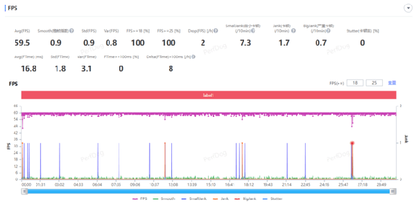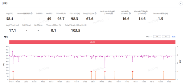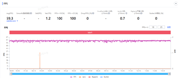 通過幀率波動我們不難發(fā)現(xiàn),使用iPhone 14取得的測試成績更加出色。iPhone 14的平均幀率為59.5幀,而iPhone 13 Pro Max的平均幀率為58.4幀。其中,iPhone 14在測試過程中幾乎沒有出現(xiàn)幀率波動,整體幀率表現(xiàn)十分平穩(wěn),也沒有出現(xiàn)任何掉幀降頻的現(xiàn)象。當(dāng)然,iPhone 13 Pro Max的表現(xiàn)也非常不錯,雖然出現(xiàn)了幾次小幅度的波動,但是未對游戲體驗造成影響,依然能為大家?guī)磔^為流暢的游戲體驗。