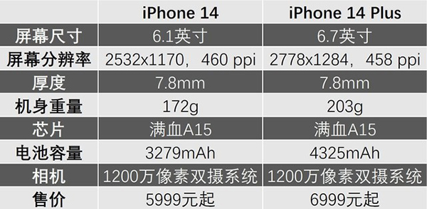 先上一張iPhone 14與iPhone 14 Plus的核心參數(shù)對(duì)比圖: