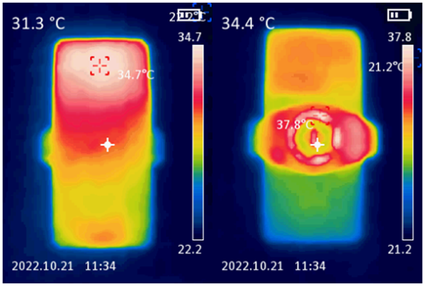 同時(shí),在20分鐘游戲之后,機(jī)身正面的溫度為34.7℃,背面的溫度大致在30℃,與沒(méi)有佩戴散熱背夾相比,機(jī)身溫度有了非常明顯的下降。
