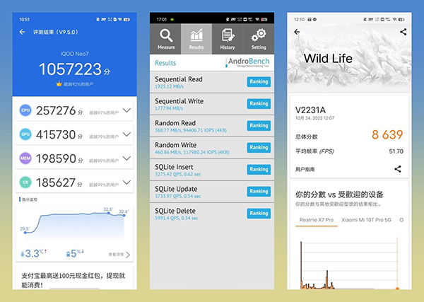 在WildLife測試項目中,iQOO Neo7總分8639,其中平均幀率為51.70fps,略低于驍龍8+,但這個成績也是安卓機的第一梯隊表現(xiàn)了;