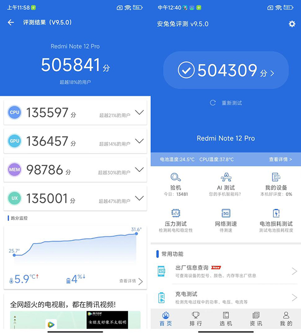 在性能測試中,Note12 Pro+的安兔兔跑分成績?yōu)?0萬分,作為對比,Note 11 Pro(天璣920)的跑分是49萬分、Note 10 Pro(天璣1100)的跑分是67萬分,K40游戲增強(qiáng)版(天璣1200)的跑分是69萬分。由此看來,天璣1080的處理器性能和前代產(chǎn)品配備的天璣920在伯仲之間。