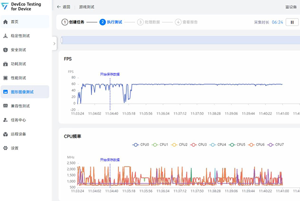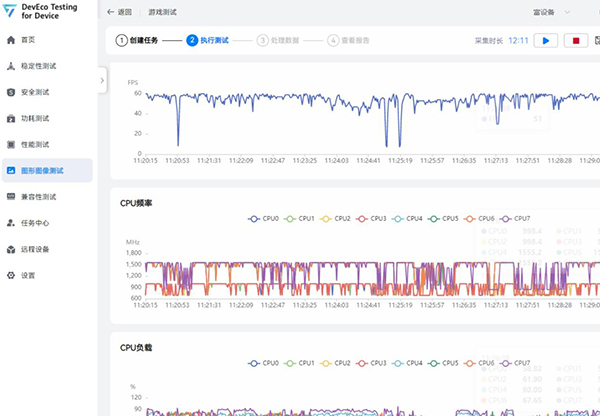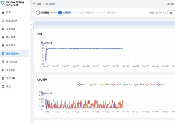 游戲開(kāi)始后曲線中有一次幀率下降到底部是載入游戲,進(jìn)入游戲后一直穩(wěn)定在60幀,游戲過(guò)程非常流暢。