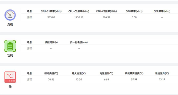 完成測(cè)試后顯示最大殼溫在43.2攝氏度,系統(tǒng)最高溫度還不到60攝氏度,游戲過(guò)程中系統(tǒng)溫度只上升了13.17攝氏度,溫度控制效果不錯(cuò)。