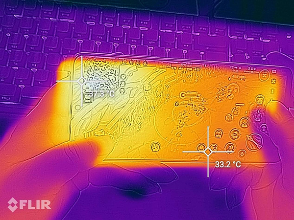 在游戲測(cè)試中用熱成像儀拍攝手機(jī),屏幕方向最熱的地方為37.5攝氏度,只比人體溫高一點(diǎn),略微有溫?zé)岣小?