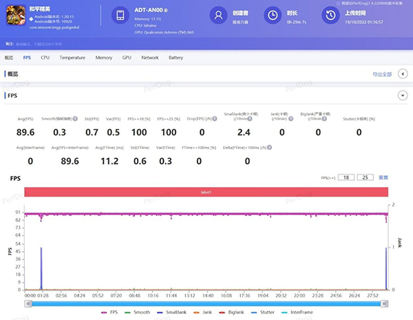 《和平精英》在玩了半個(gè)小時(shí)左右,用性能狗測(cè)得的平均幀率為89.6左右,游戲體驗(yàn)的過(guò)程非常流暢。