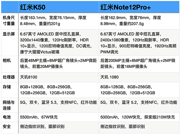 紅米K50與紅米Note12 Pro+主要參數(shù)對比圖:
