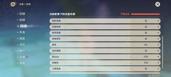 原神游戲?qū)τ谑謾C(jī)性能要求較高,設(shè)置各項(xiàng)畫面選項(xiàng)為高,開啟TAA抗鋸齒,幀率設(shè)置為60fps,游戲開始提升當(dāng)前配置下的設(shè)備負(fù)載嚴(yán)重過高。