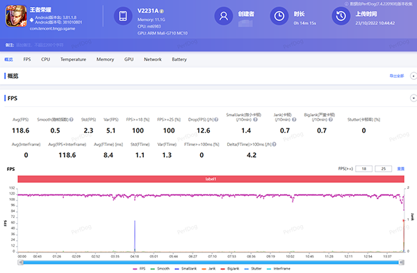 在游戲?qū)崪y環(huán)節(jié)中,我選擇了《王者榮耀》和《原神》這兩款比較有代表性的游戲作為測試項(xiàng)目。通過下圖可以看到,iQOO Neo7在運(yùn)行120幀《王者榮耀》時(shí),平均幀率顯示為118.6,而且?guī)是€的波動(dòng)并不明顯,整個(gè)游戲過程也比較流暢。