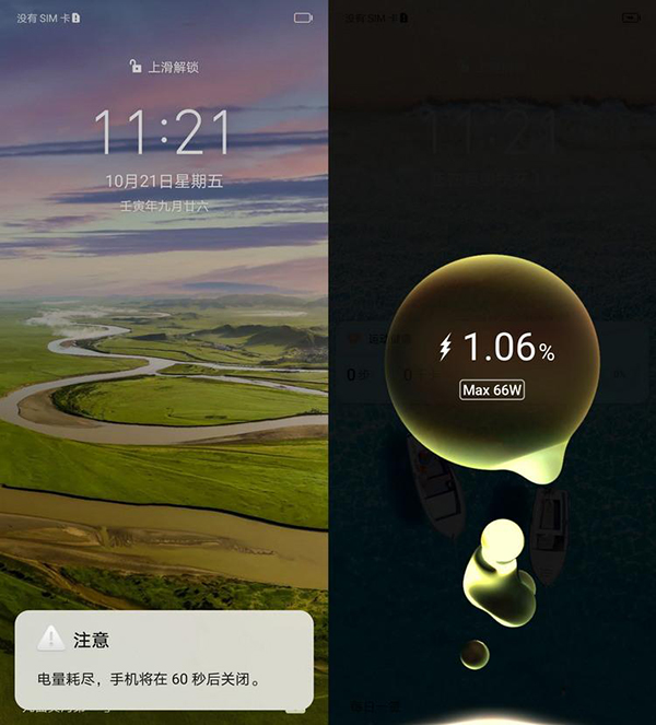 在開始充電10分鐘和21分鐘時(shí)我們點(diǎn)亮屏幕看到,X40 GT在開始充電10分鐘后顯示已經(jīng)充入36%的電量,開始充電21分鐘后,這個(gè)數(shù)字來(lái)到了70%。